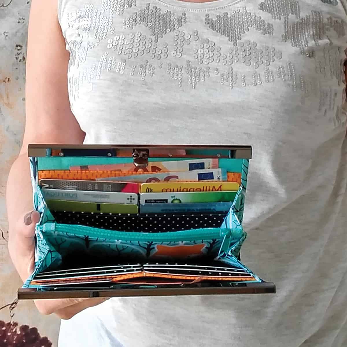 De portefeuille heeft 3 brede steekvakken, 2 kleinere steekvakken, een ritsvakje voor muntgeld en 12 kaartvakjes. Er is ook voldoende plaats voor je smartphone. Zodra alles geknipt en verstevigd is, zet dit patroon verrassend vlot in elkaar. Geschikt voor een zelfzekere beginner met een can-do mentaliteit — en dat ben jij.